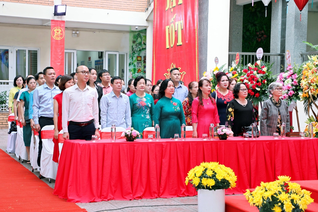 Ngay từ lúc đặt chân tới sân trường TH Nghĩa Tân, ai cũng phải trầm trồ trước sự trang trí của nhà trường với hàng ngàn đóa hoa tươi thắm trên sân khấu và rất nhiều lẵng hoa rực rỡ của các vị khách quý.