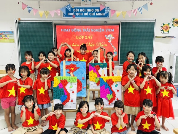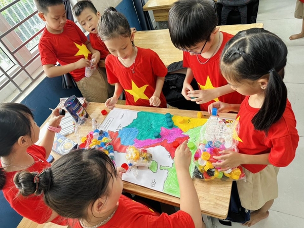 Trường Tiểu học Minh Khai A (phường Tây Tựu, TP Hà Nội): Các em học sinh đã cùng nhau khéo léo biến những vật liệu tưởng chừng bỏ đi thành bản đồ Việt Nam - hình ảnh Tổ quốc yêu thương.