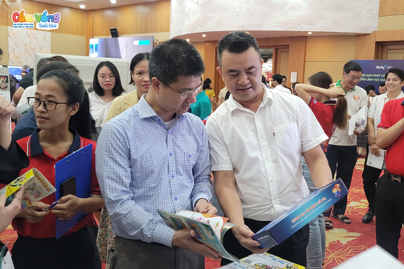 Ảnh 3: TS. Tô Hồng Nam - Cục phó Cục Công nghệ Thông tin - Bộ Giáo dục và Đào tạo tham quan gian hàng Cầu Vồng Tuổi Thơ.