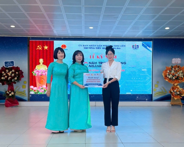 Đại diện Elmich Việt Nam và Cầu Vồng Tuổi thơ trao quà tại Trường Liên cấp THCS, Tiểu học tư thục Ngôi Sao Hà Nội (P. Yên Hoà, Hà Nội) check-in tại Photobooth.