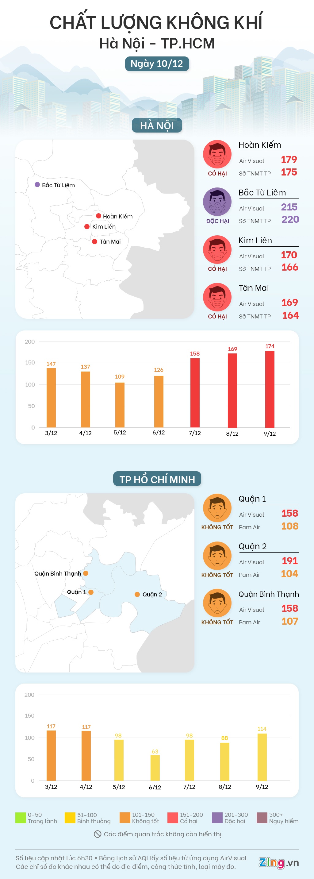 Theo trang quan trắc AQI thời gian thực AirVisual, chất lượng không khí trung bình ở Thủ đô sáng 10/12 là 181. Trong đó, khu vực Đại sứ quán Mỹ có chỉ số AQI 218, Tây Hồ là 212 (mức tím - rất xấu). Khu vực Tô Ngọc Vân 197; Chi cục Bảo vệ môi trường 193… tiệm cận mức rất xấu.