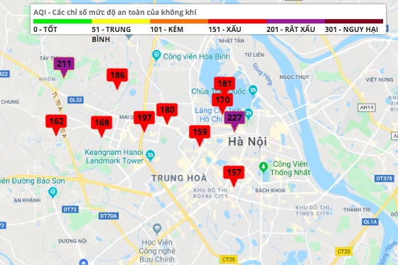 Theo trang quan trắc AQI chính thức của Hà Nội (tại địa chỉ moitruongthudo.vn), chất lượng không khí ở mức xấu và rất xấu (hơn 200).