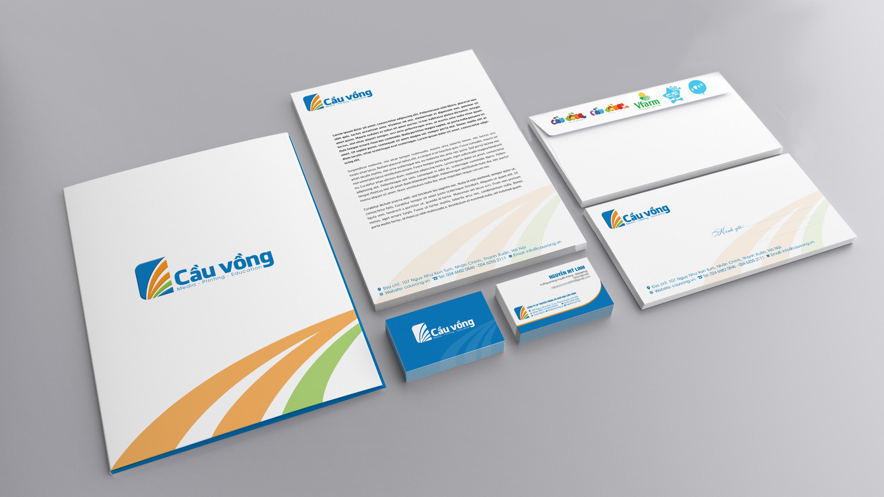 - Logo thương hiệu: là sự cách điệu hai chữ CV (viết tắt tên công ty Cầu Vồng) trên khối vuông vững chắc thể hiện sự an toàn và uy tín, cùng ba dải màu xanh dương, cam, xanh lá. Bên dưới tên Công ty là ba lĩnh vực hoạt động chính: Media- Printing- Education.