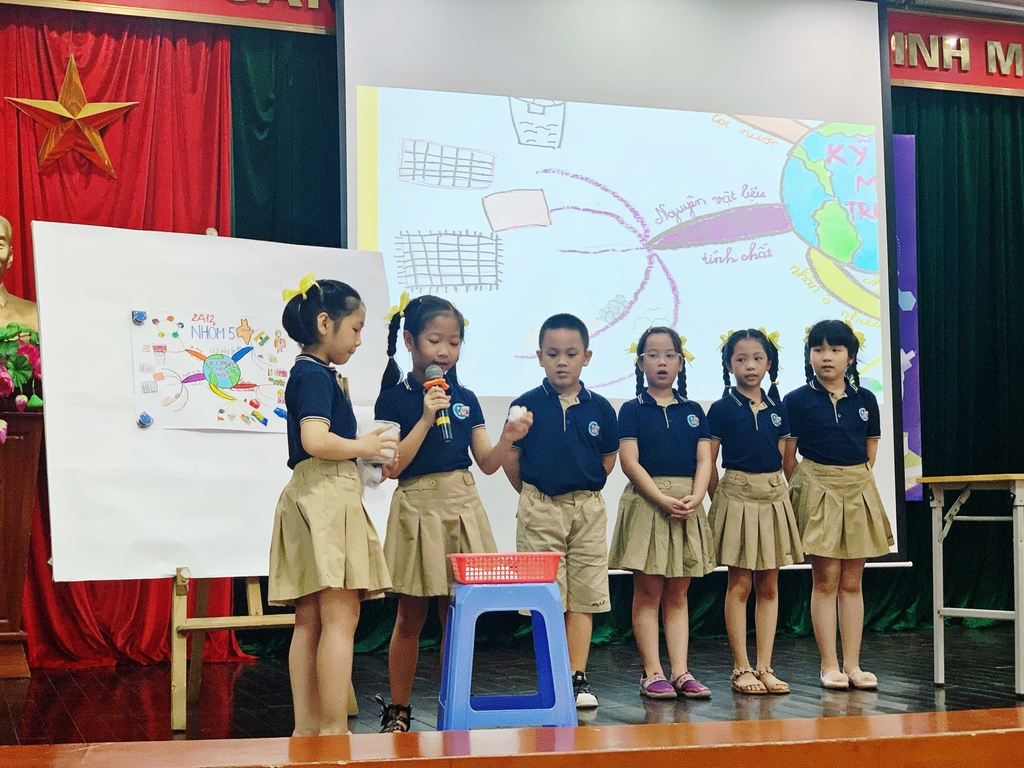 Lớp 2A12 đang giới thiệu về các nguyên vật liệu khi thực hiện dự án
