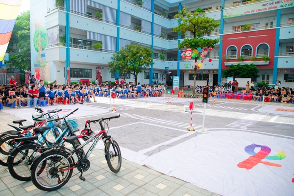 Tại ngay dưới sân, nhà trường đã bố trí mô hình “Sa hình” tái hiện lại một ngã tư đường phố để các học sinh khối 3 có thể phần nào hình dung được hoạt động tham gia giao thông thực tế.