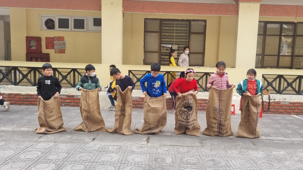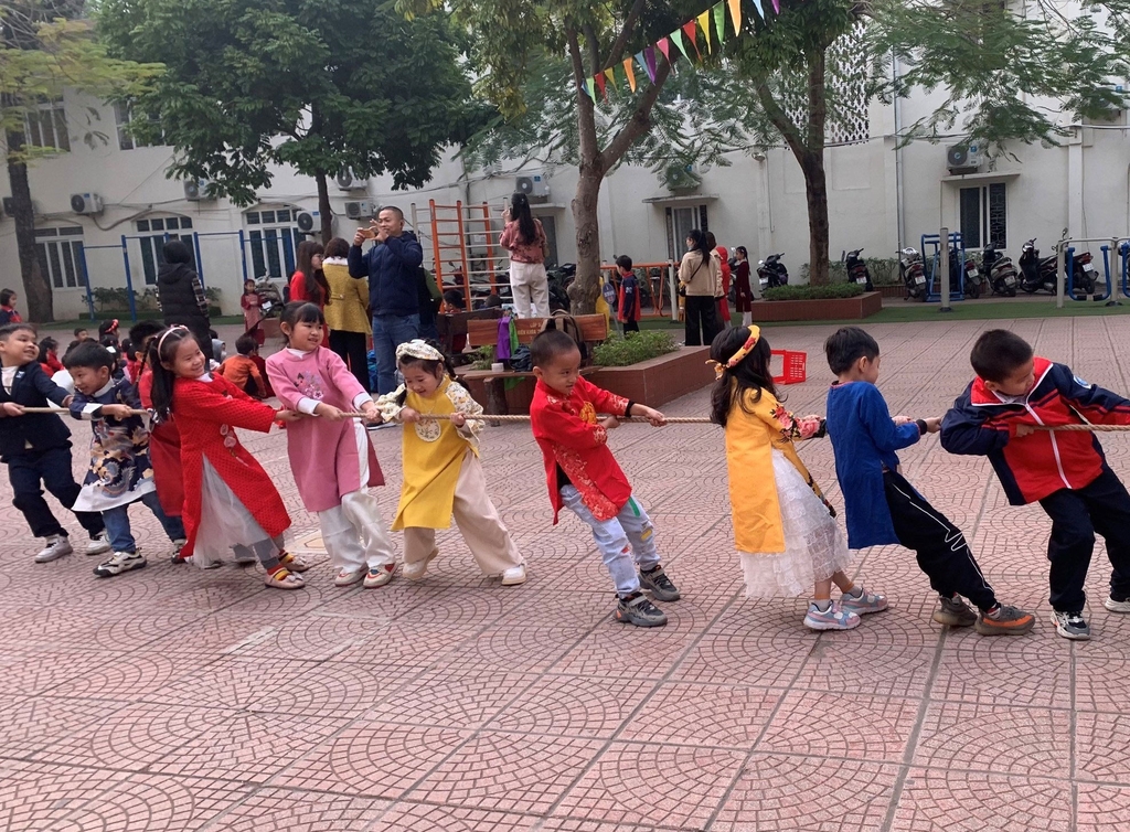 Trong khi chờ những chiếc bánh xinh xắn được đem luộc, ngày hội tiếp tục diễn ra tưng bừng với góc trò chơi dân gian như: ném còn, múa sạp, nhảy bao bố, cầu khỉ … Bạn nhỏ nào cũng hồ hởi và náo nức. Rồi các góc chơi ô ăn quan, cờ ca-ro…. luôn rộn rã tiếng nói cười. Đặc biệt, trò chơi cuốn hút không chỉ các bạn nhỏ mà còn đông đảo các thầy cô giáo tham gia chính là góc chơi Kéo co, nơi những keo đấu gay cấn, vui vẻ diễn ra giữa các khối lớp!