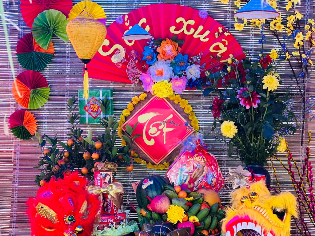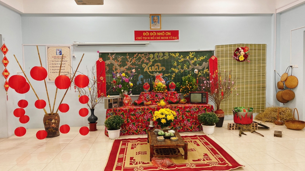 Đầu tiên, lễ hội mở ra không gian tết qua các gian trưng bày sầm uất chia theo các khối. Với mỗi gian hàng, bạn học sinh được thuyết trình giới thiệu về gian hàng của mình, chúng ta không khỏi ngỡ ngàng trước sự am hiểu của các em học sinh về phong tục tập quán của dân tộc - đó là phong tục Tết.![]()
