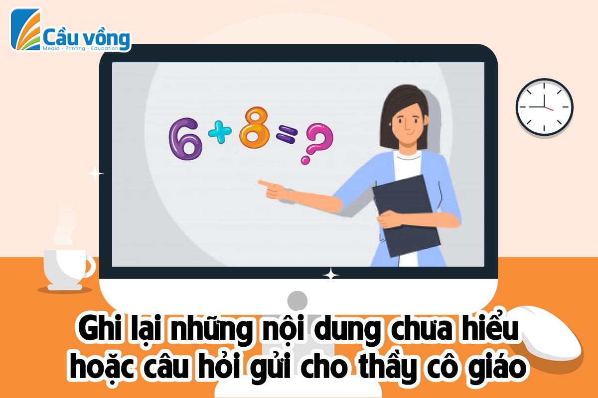 Khi học trên lớp, nếu có phần chưa hiểu, các em có thể hỏi trực tiếp thầy cô để thầy cô có thể giảng lại cho mình. Đừng lo lắng nếu trong lúc học online các em không thể hỏi được thầy cô nhé. Hãy nhanh tay ghi chép lại các phần chưa hiểu trong quá trình nghe giảng sau khi kết thúc bài học trực tuyến để gửi cho thầy cô nhé. Các thầy cô sẽ luôn giải đáp cho chúng mình ngay thôi.
