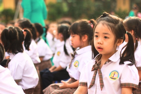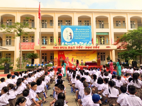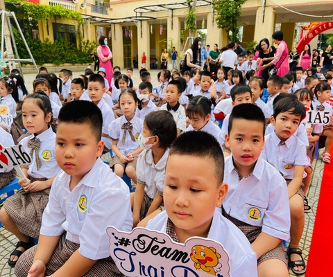 Ngôi trường chào đón các bạn nhỏ với rực rỡ màu sắc. Nào là màu hoa tươi tắn được các bác lao công chăm chút, rồi màu áo dài xanh hồng nổi bật của cô giáo trìu mến, màu cổng hiệu chào đón, màu xanh trắng phơi phới của bóng bay khai giảng…