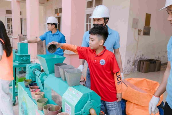 Bên cạnh đó, giàn máy tái chế chai lọ nhựa ra chậu cây đem đến cho học sinh một trải nghiệm vô cùng trực quan, các em cùng quan sát quy trình biến rác thải nhựa thành những sản phẩm hữu ích, trực tiếp được các cô chú kỹ sư hướng dẫn vận hành máy. Các trò chơi vận động lồng ghép nội dung về môi trường và sống xanh cũng tạo nên không khí sôi nổi, giúp học sinh dễ dàng tiếp nhận và ghi nhớ kiến thức.