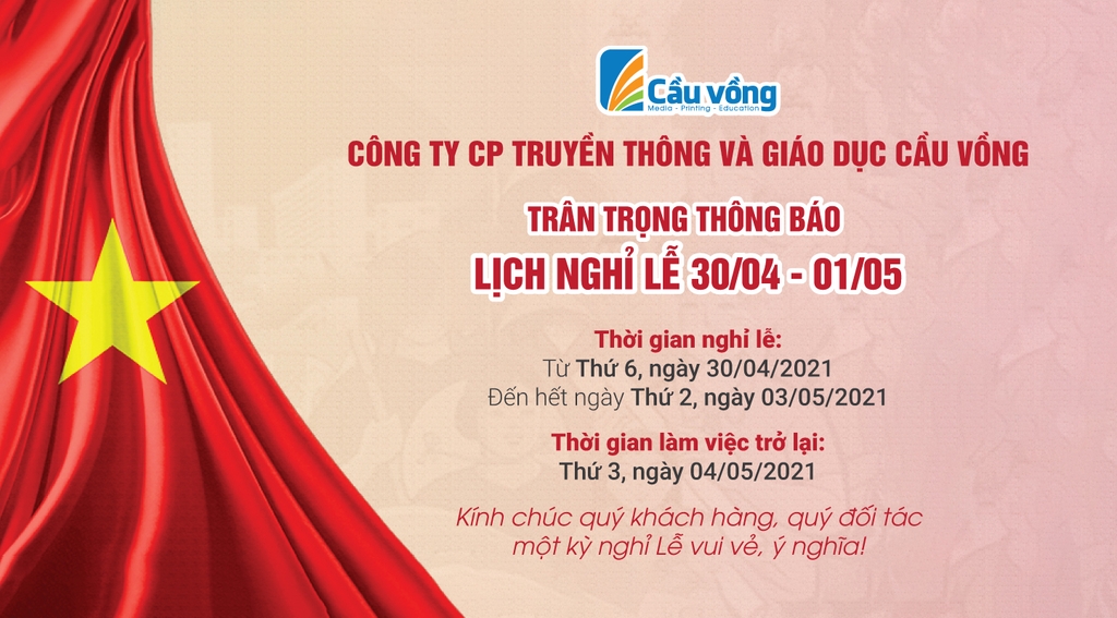 Công ty CP Truyền thông và Giáo dục Cầu Vồng xin trân trọng thông báo tới quý khách hàng, quý đối tác về lịch nghỉ Lễ 30/04 - 01/05.