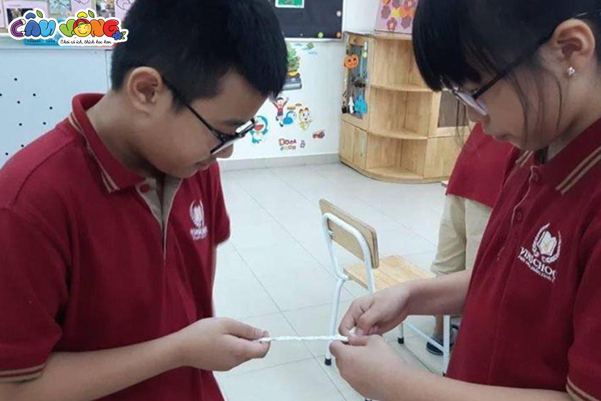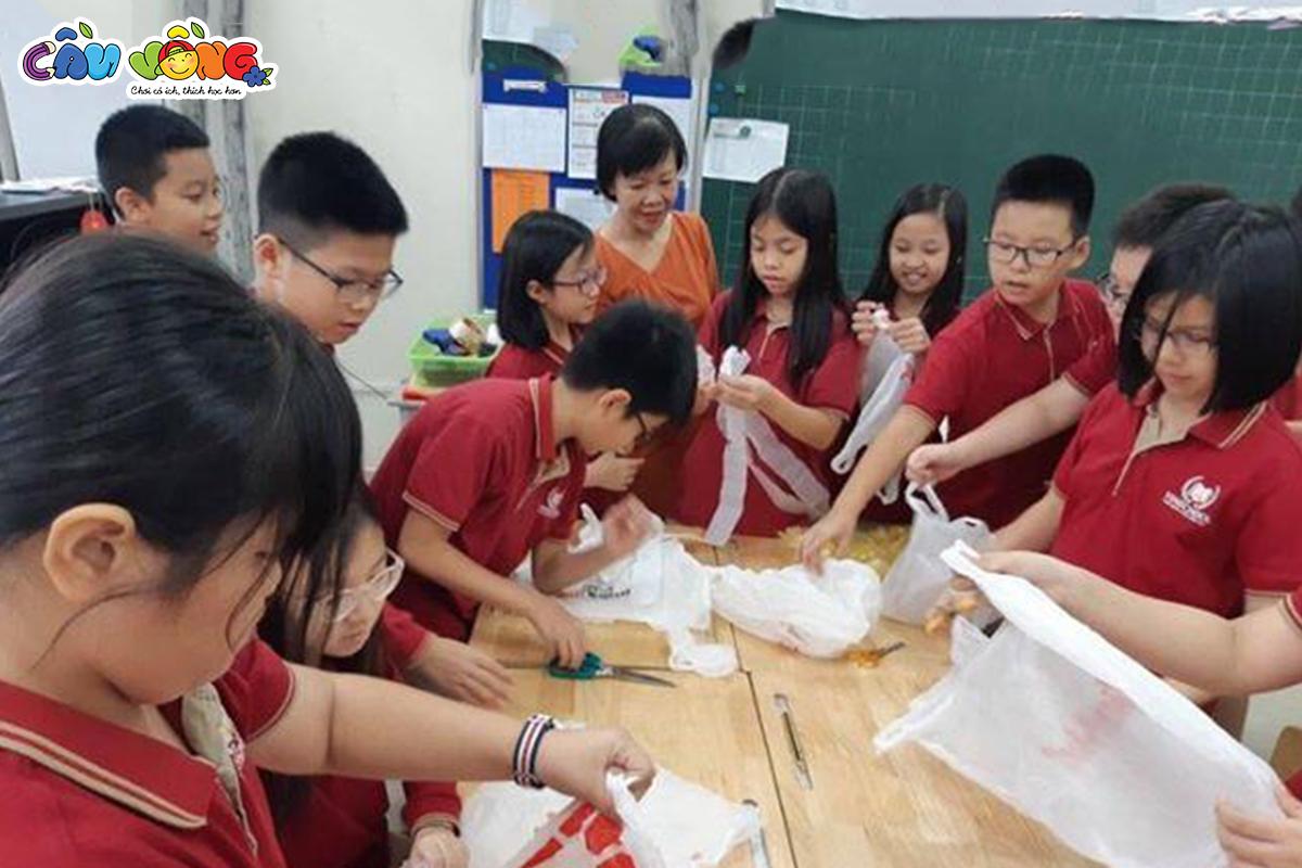 Các bạn học sinh lớp 5, trường tiểu học Vinschool cùng bắt tay làm giỏ đựng đồ bằng túi nilong dưới sự hướng dẫn của Trâm An