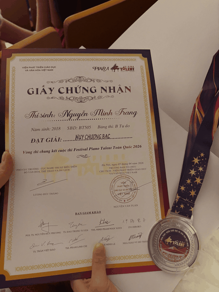 Chúc mừng em Nguyễn Minh Trang với Huy chương Bạc tại Festival Piano Talent Toàn quốc 2026. Chặng đường phía trước còn dài, nhưng với nền tảng đã có và sự nỗ lực không ngừng, tin rằng em sẽ tiếp tục tiến xa hơn, không chỉ trong âm nhạc mà còn trong hành trình trưởng thành của chính mình.