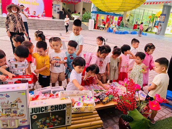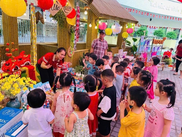 Những gian hàng được trang trí công phu, mang đậm sắc màu dân gian, cùng sự góp mặt duyên dáng của các cô giáo trong trang phục truyền thống. Không chỉ là không gian mua sắm, trải nghiệm mà còn là nơi gửi gắm những giá trị văn hóa, gắn kết tình thân.